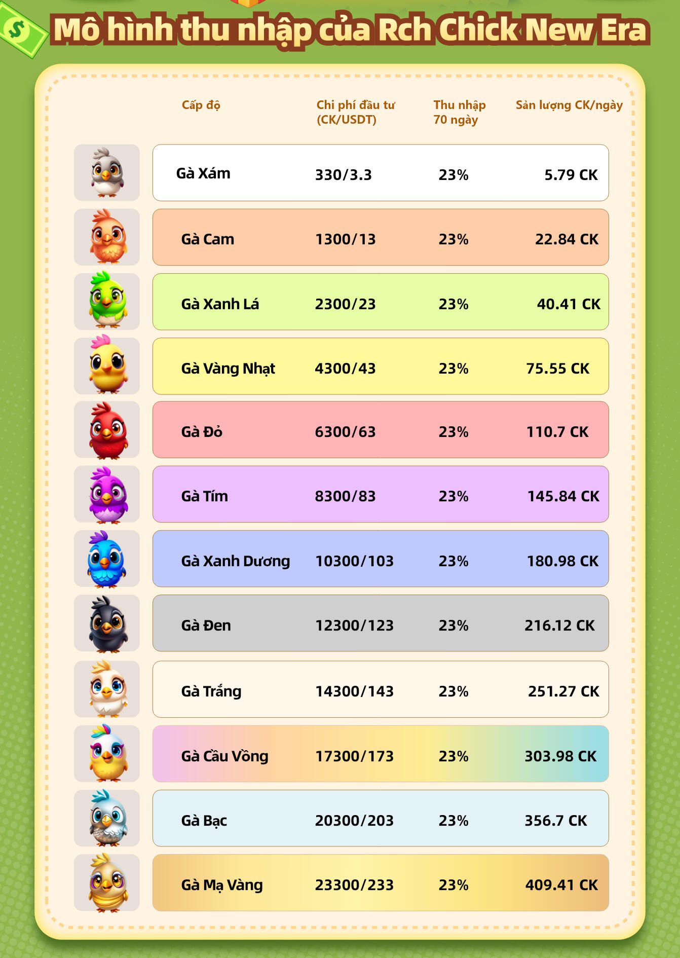 Có thể tái đầu tư (mua lại gà) để mở rộng lợi nhuận.Hãy coi CK như “token lợi nhuận trong game” — bạn nuôi càng nhiều, thì càng tạo ra nhiều CK.