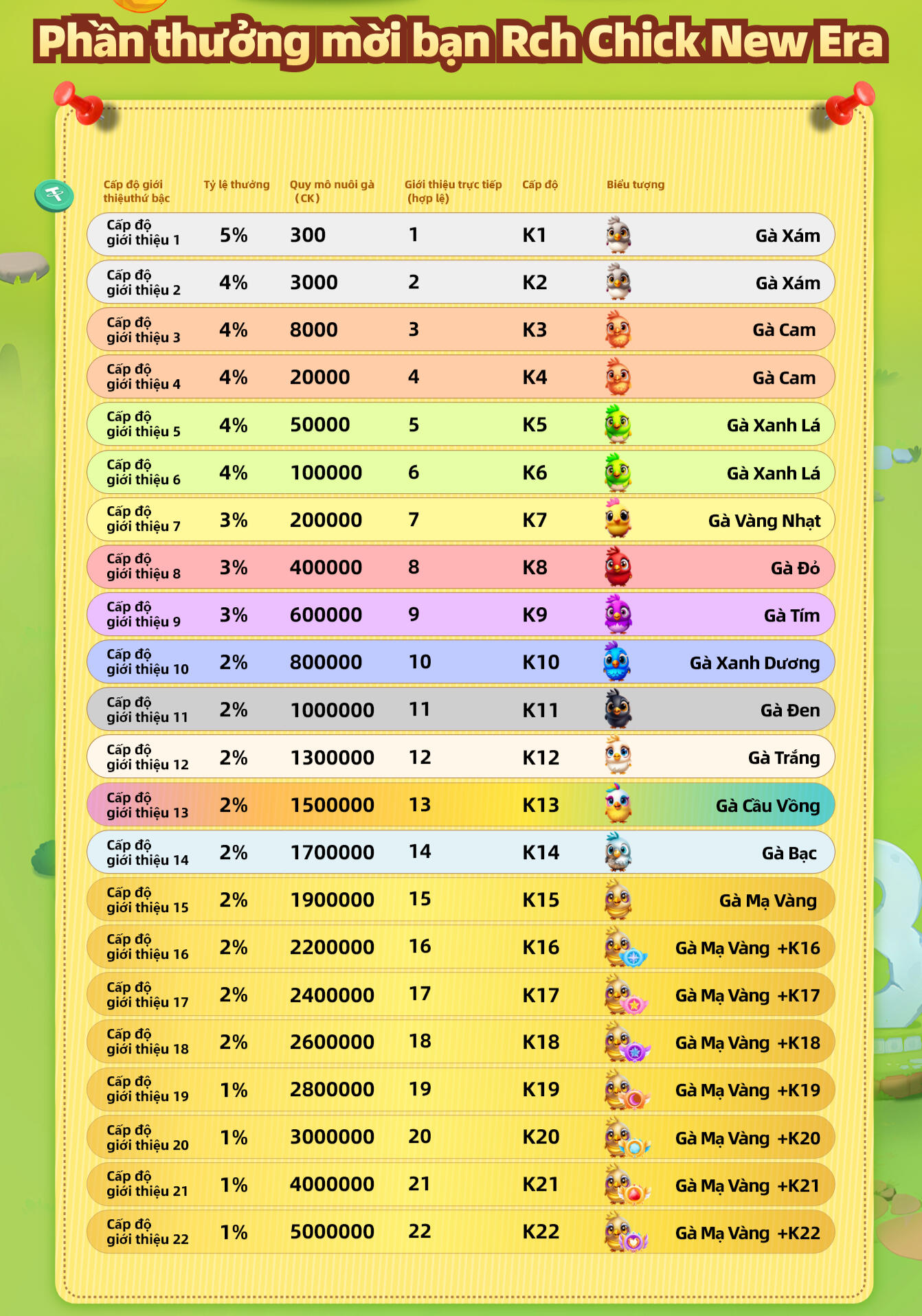 Mời bạn bè mua gà và ngay lập tức nhận3% phần thưởng.Yêu cầu người dùng hợp lệ: Tổng mua ≥ 500 CK.Điều kiện nhận thưởng giới thiệu trực tiếp: Bạn phải tự sở hữu ít nhất 300 CK giá trị gà để mở khóa phần thưởng giới thiệu.Phần thưởng được tự động thanh toán và ghi nhận vào ngày hôm sau.Ví dụ: