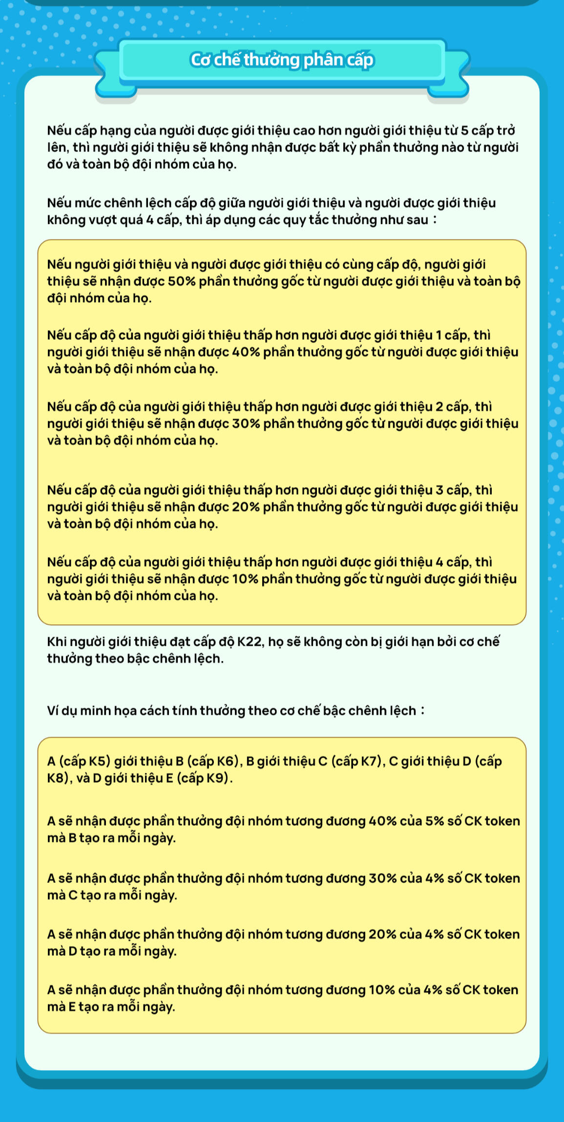 Phần thưởng có thể lên đến 22 tầng.Phần thưởng tầng 1: tối đa 5%, giảm dần xuống 1% cho các tầng thấp hơn.Điều kiện nhận thưởng: dựa trên số CK bạn tự mua + giá trị K (số lượng giới thiệu trực tiếp).Càng nhiều giới thiệu trực tiếp và tái đầu tư → càng mở khóa nhiều tầng thưởng.